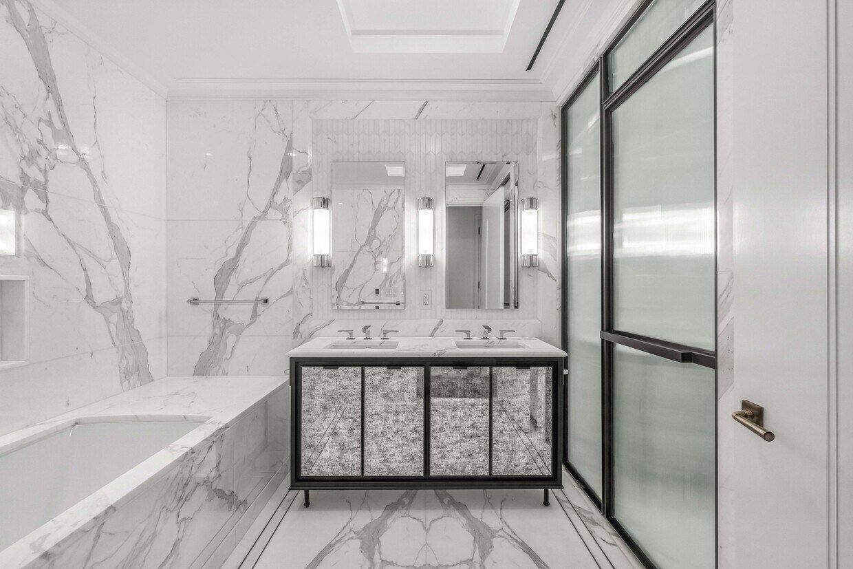 Interiors projected by the renowned David Collins Studio were brought to life by Yale Stone’s craftsmen. Elegantly-adorned kitchens feature premium Grecian marble and Perla Venata countertops, while bathrooms feature marble slab walls, Statuary countertops, and custom-made vanities with inset glass.